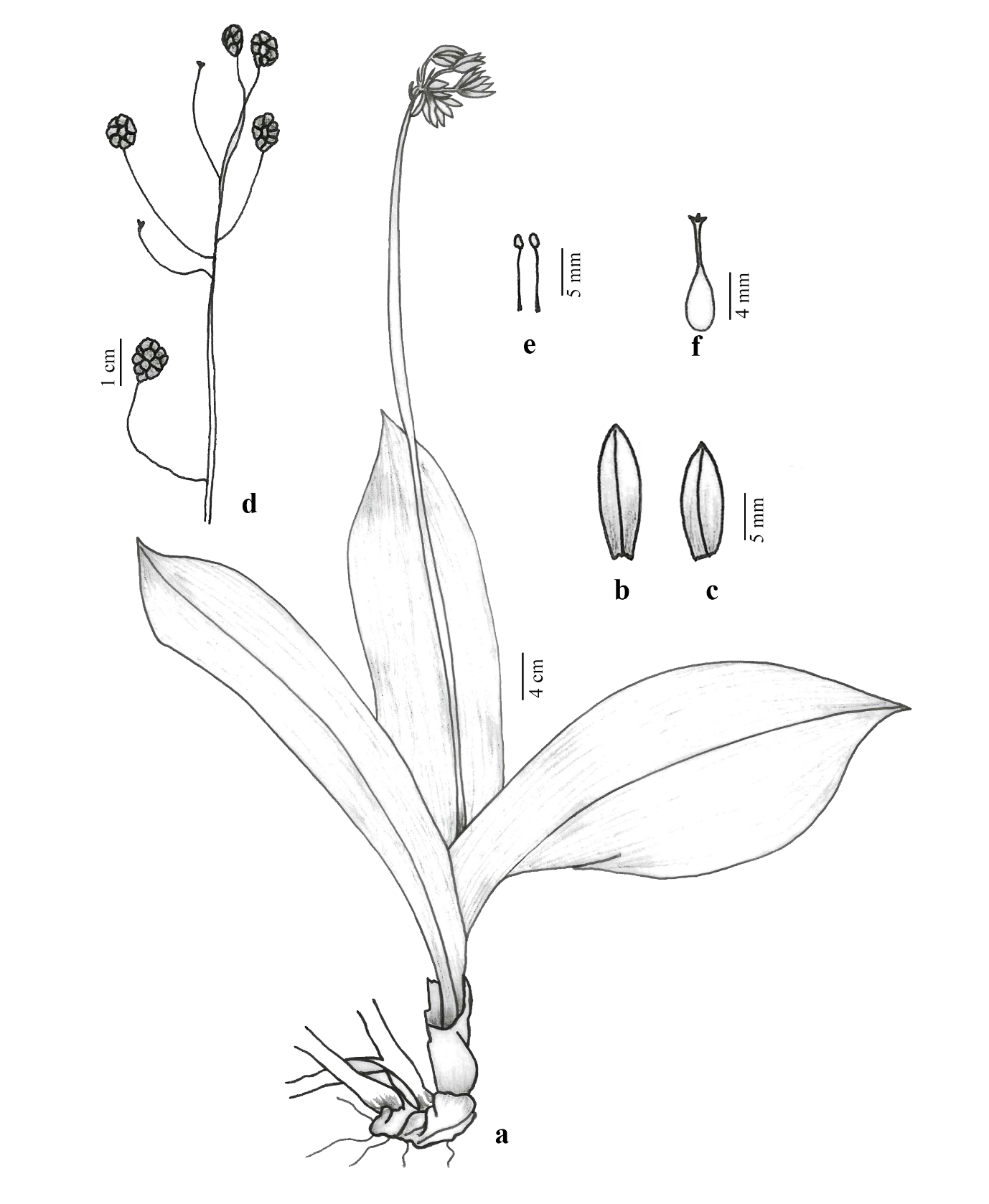 Fig. 6. Clintonia udensis var. alpina (Kunth ex Baker) H.Hara: a, habit sketch; b, c, tepals; c, stamens; d, fruit; and e, carpel.