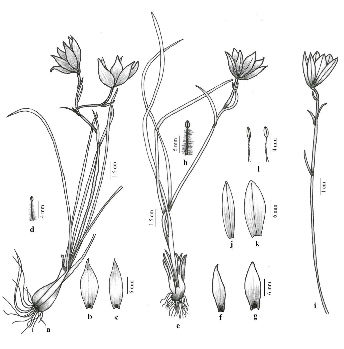 Fig. 3. Gagea lasiantha Sameer-Patil: a, habit sketch; b, c, tepals: inner and outer; and d, stamen. Gagea tibetica (Baker ex Oliv.) Sameer-Patil: e, habit sketch; f, g, tepals: outer and inner; and h, stamen. Gagea yunnanensis (Franch.) Sameer-Patil: i, habit sketch; j, k, tepals: outer and inner; and l, stamens.