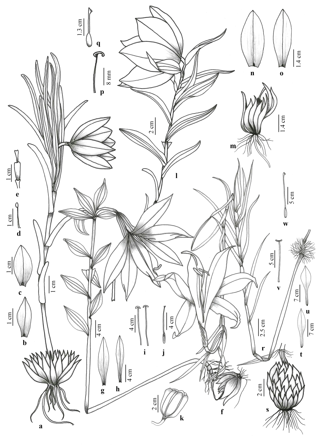 Fig. 4. Lilium nanum Klotzsch: a, habit sketch; b, c, tepals: outer and inner; d, stamen; and e, carpel. Lilium nepalense D.Don: f, habit sketch; g, h, tepals: inner and outer; i, stamens; and j, carpel. Lilium oxypetalum (D.Don) Baker: l, habit sketch; m, bulb; n, o, tepals: inner and outer; p, stamens; and q, carpel. Lilium wallichianum Schult. & Schult.f.: r, habit sketch; s, bulb t, u, tepals: outer and inner; v, stamen; and w, carpel.